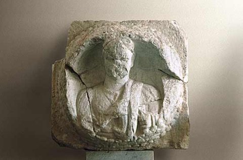 - Kubischer Block, auf der Vorderseite Lorbeerkranz mit Astragalband, darin Brustbild eines Mannes: bartlos, Tunica, Toga, in der Linken Rolle (volumen).