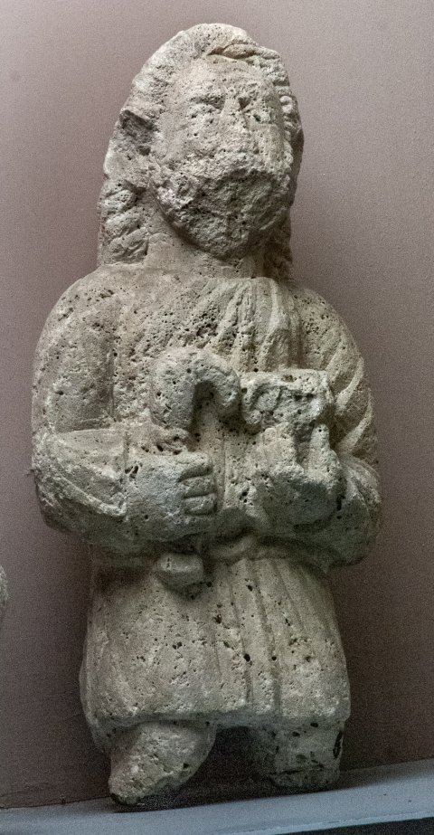 - Mythische Figur : bärtiger Silvanus in gegürteter Ärmeltunica, in der Rechten Winzermesser, in der Linken zweihenkeliges Gefäß.