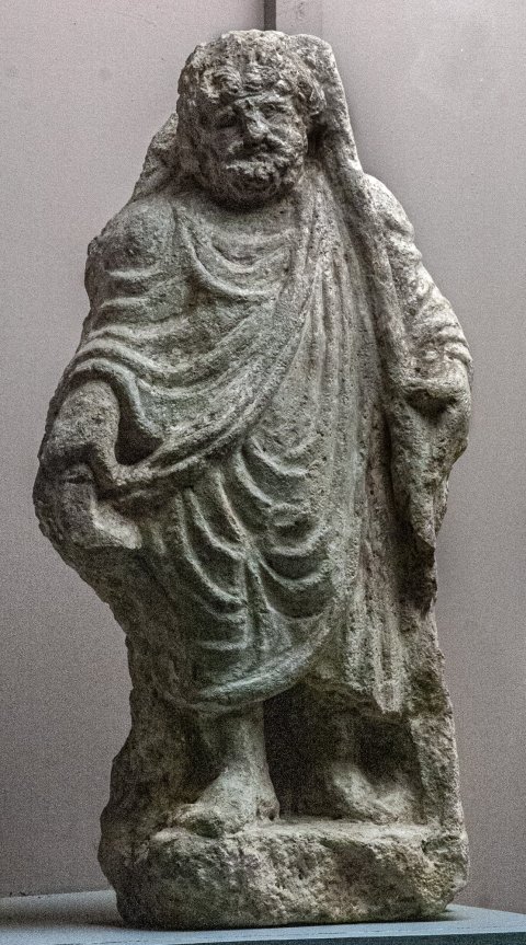 - Mythische Figur : bärtiger Silvanus stehend auf einem Podest, Mantel und Unterkleidung, in der Rechten Winzermesser, im linken Arm langer Stab.