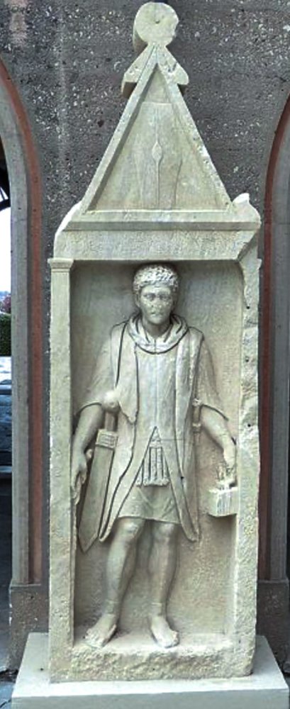 - Steiles Giebeldach mit zylindrischem First und Ansätzen von Eckakroteren (?), im Giebelfeld eckiger Schild. Eingetiefte Bildnische zwischen glatten Pilastern. Stehende Ganzfigur eines bartlosen Soldaten mit kurzen Locken, bekleidet mit Halstuch, Paenula, kurzer Tunica, in der Rechten Stock, in der Linken zusammengeklapptes Polyptychon (?). Waffen: Gürtel mit Streifenschurz, an der rechten Hüfte Schwert (gladius), an der linken Dolch.