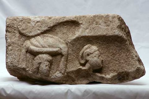 - Eingetieftes Bildfeld mit Rest des oberen Rahmens mit Volute. Darunter Köpfe von zwei nach rechts gewandten Frauen, von denen die linke mit beiden Händen eine Korb auf dem Kopf trägt. Die Vordere im Profil mit Scheitelzopffrisur.