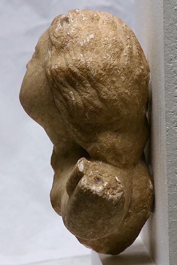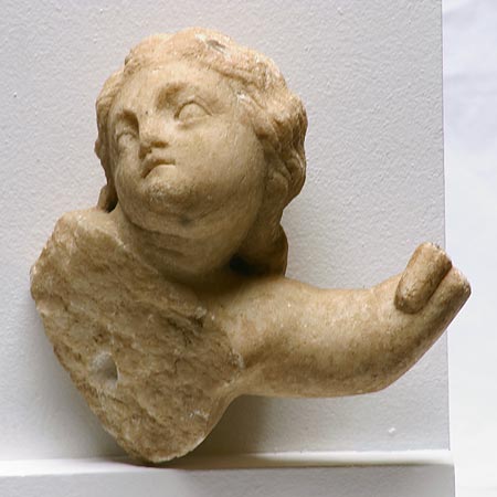 - Mythische Figur (Eros ?, Psyche ?) : Kind (Mädchen ?) mit langem, leicht gewelltem Haar mit Scheitelzopf, Kopf nach oben und zur rechten Schulter gedreht, linker Arm erhoben zur Seite gestreckt, am Unterarm Ende eines stabartigen Gegenstandes (Fackel ?). Auf dem Rücken Ansatz eines glatten Flügels.