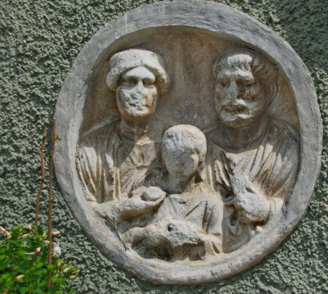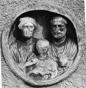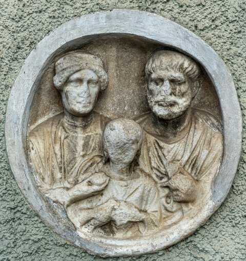 - Familie: Brustbilder eines Ehepaares mit Kind. Links einheimische Frau: Haube, Umhang, Fibeln, zwei Halsreifen mit Lunula, in der Rechten Apfel. Rechts Mann: bärtig, Tunica, Toga, in der Linken Rolle (volumen). Vorn Mädchen: offenes Haar, Ärmeltunica, in der Rechten Vogel.