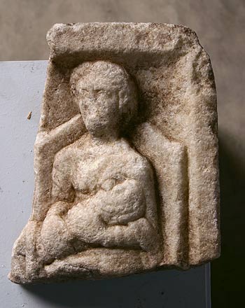 - Mythische Figur : einfach gerahmte Tafel, am rechten Rand auf Sessel mit hoher Lehne sitzende Nutrix mit Wickelkind in den Armen.