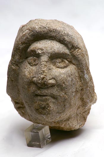 - Porträtkopf eines Mannes (?) mit wulstigem Haarkranz über Stirn, Ohren und Nacken.
