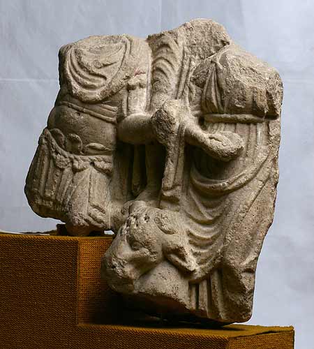 - Mythische Figur (Jupiter Dolichenus ?, Juno Regina ?) : links Mann in Brustpanzer mit Streifenschurz, Binde und Schwertgurt. Mantel auf der rechten Schulter befestigt. Schrittstellung nach rechts, an der rechten Hüfte Schwert und Rest eines Kopfes (kniende Figur ?), in der vorgestreckten Linken Attribut (Blitz ?, Axt ?). Rechts stehende weibliche Figur in hochgegürtetem Chiton und Mantel, in der Rechten Schale. Zwischen den Beiden liegender Stier. Über diesem Rest einer stehenden langgewandeten Figur (Victoria ?).