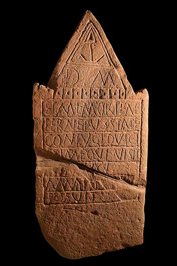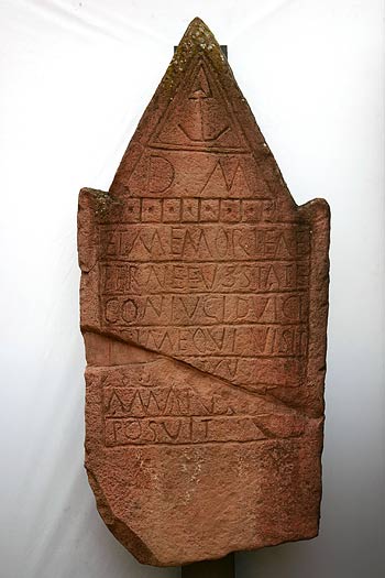 - Stele mit Giebel und seitlichen Akroteren. Der Giebel ist hoch und spitz, die Akrotere verkümmert. Die Basis des Giebels bilden acht punktierte Quadrate. Darüber sind zwei Dreiecke, ein "ankerförmiges" Zeichen und die Buchstaben D M eingeritzt. Das Schriftfeld wird von einer Rille eingefasst, die Zeilen werden durch horizontale Linien getrennt.