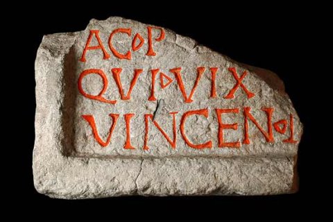 Grabinschrift : [------] / ac(tarius) p(editum) [---] / qui vix[it ---] / Vincen(tius) h[er(es) p(onendum) c(uravit)]