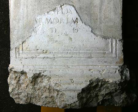 - Aesculapio / Aug(usto) / Ti(berius) Cl(audius) Cl[au]di/[anus - - -] XI / [- - -] / [aram signa et / bas]es posu[it et / m]armore mu[nivit] / l(ocus) d(atus) d(ecreto) [d(ecurionum)]