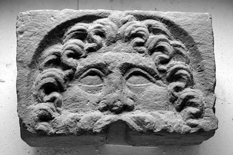 - in eingetieftem runden Bildfeld Gesicht mit Vollbart und langem gelockten Haar. Mundöffnung als Wasserauslass.