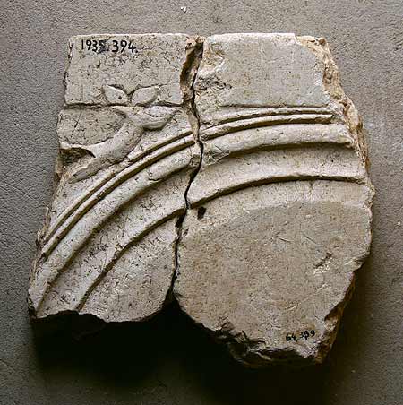 - Platte mit oberem glatten Randstreifen, darunter Reste des profilierten Rahmens eines Medaillons oder Bogens. Im linken Zwickel zwischen Bogen und Rand Rest eines Fisches (Delphin ?).