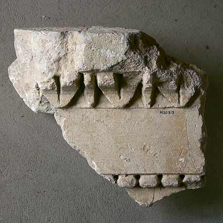 - Oben glatter vorspringender Randstreifen, darunter Blattkyma, glatter Streifen, Fascie mit Perlstab.