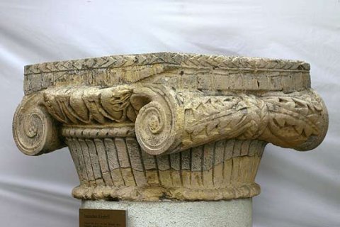 - Kapitell: Unten Perlstab, darüber Kranz aus glatten Zungenblättern, darüber tordierter Rundstab. Eierstab und mit Zopfband eingeschnürte Voluten mit Blattdekor. Abacusseiten senkrecht gekerbt, oberster Abschluss mit liegendem Zackenband.