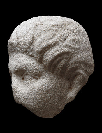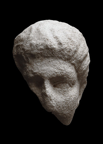 - Unterlebensgroßer Kopf eines bartlosen Mannes (Jünglings) mit dichtem, leicht gewelltem, in die Stirn gekämmtem Haar.