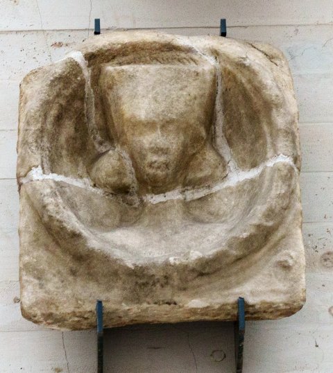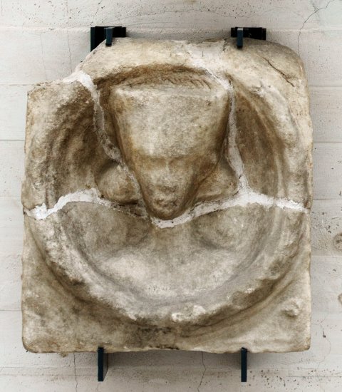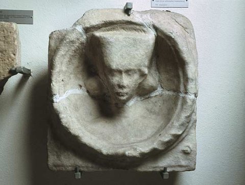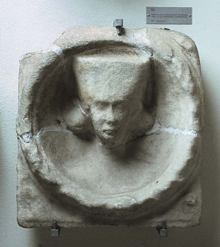 - Rechteckige Platte mit Kranzrahmen, darin Büste einer einheimischen Frau mit Modiushaube.