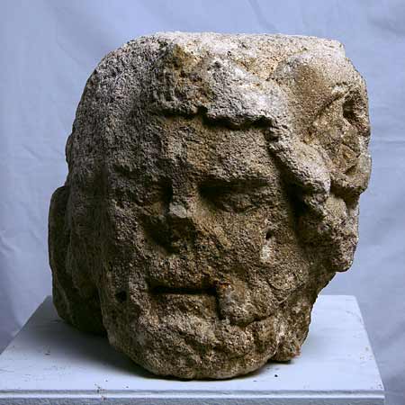 - Mythische Figur (Jupiter-Ammon) : bärtiger Kopf mit Widderhörnern. Vermutlich Mittelteil eines Stelenaufsatzes mit liegenden Löwen.