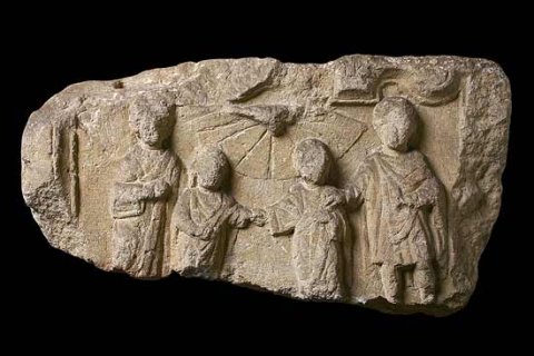 - Bildfeld mit profiliertem, oben geschwungenem Rahmen. Unter einer Muschel Ganzfiguren einer Familie (Ehepaar und zwei Kinder): links Frau in Ärmelkleid und Mantel, Halskette, in der Rechten Apfel. In der Mitte unter einer Muschel links Mädchen (?) in Ärmelkleid und Mantel, rechts Knabe in langer Ärmeltunica und Toga (?). die Kinder reichen sich die Hände. Rechts Mann in kurzer Ärmeltunica und Sagum mit Scheibenfibel.