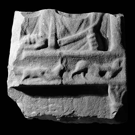 - Hauptbild: zwei Brustbilder (Ehepaar). Links Frau in Tunica und Mantel, rechts Mann in Toga (?), in der Linken Rolle (volumen). Zwischenfries mit jagenden Tieren. Schriftfeld von Säulen mit Blattkapitellen gerahmt.