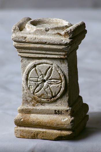 - Oben runde Schale zwischen pulvini. Auf der Vorderseite Kreisrosette.