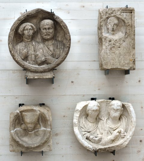 - In Medaillon mit Kranzrahmen Büste eines Kindes (Knabe) mit Tunica.