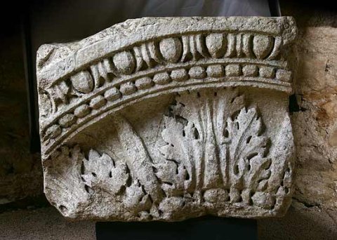 - Teil des Bauschmucks der 2. Forumsbasilika. Profilierter Clipeusrahmen mit Eierstab, Perlstab, Akanthusblattkranz. Im Inneren Büste ?