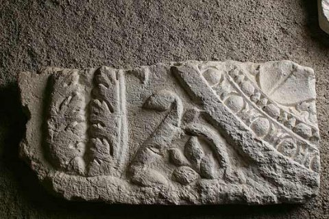- Teil der 2. Forumsbasilika. Rechts Rest eines profilierten Clipeus-Rahmens mit Eierstab, Perlstab und Blattkranz. Im Zwickel zwischen unterem Rand und Clipeus Akanthuskelch zwischen Ranken.