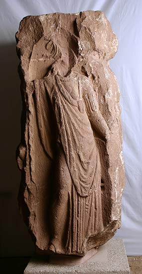 - Mythische Figuren : Juno in Chiton und Mantel, die gesenkte Rechte über einem Altar. Apollo in Schrittstellung nach rechts, nackt bis auf Mantel, lange Schulterlocken, linker Arm erhoben, hinter der rechten Schulter Köcher. Hercules schwingt mit der Rechten die Keule und packt mit der Linken eine gefallene Amazone am Haar. Minerva in Chiton, Mantel und Helm. am linken Oberarm Laschen (Brustpanzer ?), über der linken Schulter Gurt, die Linke auf dem Rand eines großen Ovalschildes, die erhobene Rechte hielt die Lanze.