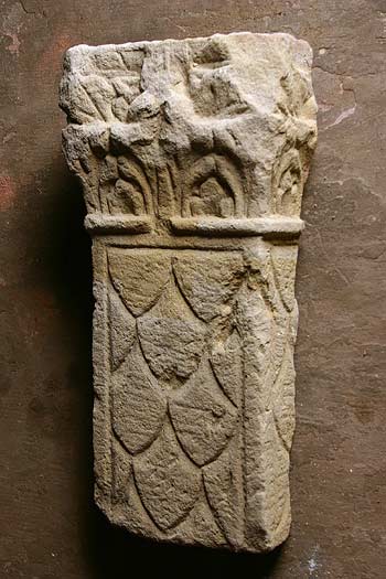 - Schaft des Pilasters (Pfeilers ?) mit Schuppenmuster. Korinthisches Kapitell.