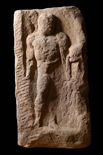 - Mythische Figuren : Juno in Chiton, Mantel und Schleier, Rechte über balusterförmigem Altar, in der Linken Kästchen. Auf der linken Nebenseite des Steins Rest einer Minerva (Schild und Eule). Hercules mit Löwenfell über linkem Arm, auf der linken Hand Äpfel (?), die Rechte auf Keule gestützt.