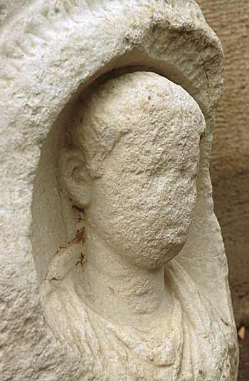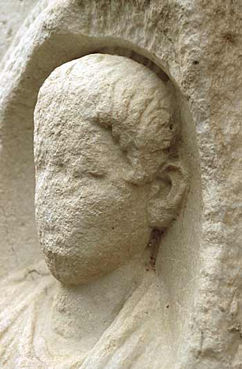 - In Medaillon mit profiliertem Rahmen Büste eines Mannes: bartlos, Tunica, Toga.