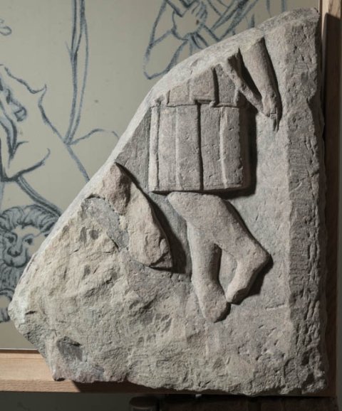 - Mythos (Mithras) : Fragment eines Kultbildes mit Stiertötung (Tauroktonie). Erhalten ist ein Vorderbein des Stieres und der am rechten Rand stehende Cautes mit gekreuzten Beinen, kurzer Tunica und Fackel in der linken Hand.