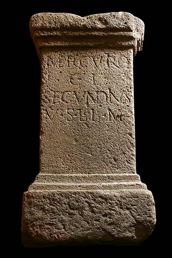 - Mercurio / Cl(audius) / Secundinus / v(otum) s(olvit) l(ibens) l(aetus) m(erito)