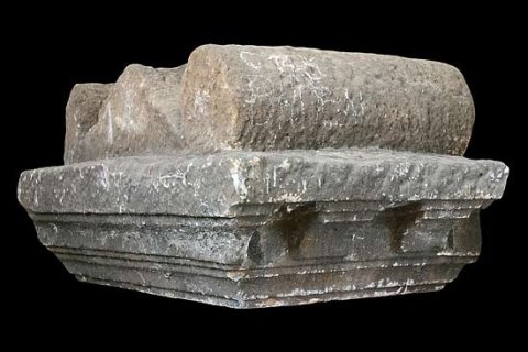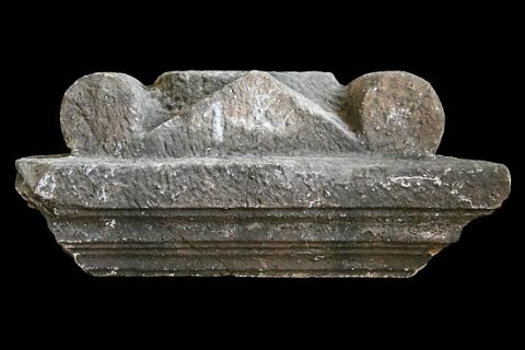 - An drei Seiten profiliertes Gesims, Rückseite geglättet. Auf den Schmalseiten je zwei glatte Konsolen. Oben undekorierter Giebel und runde Opferschale zwischen Voluten (pulvini).