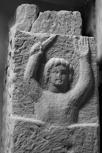 - Mythos : Oberseite des Blockes nach vorn zu abgestuft. Auf der vorderen Schmalseite im oberen Drittel nackter Oberkörper eines Jünglings mit erhobenen Armen, in der Rechten Messer (Felsgeburt des Mithras). Der Pfeiler trug zusammen mit Nr. 8565 das Kultbild des Mithräums (Nr. 8553).