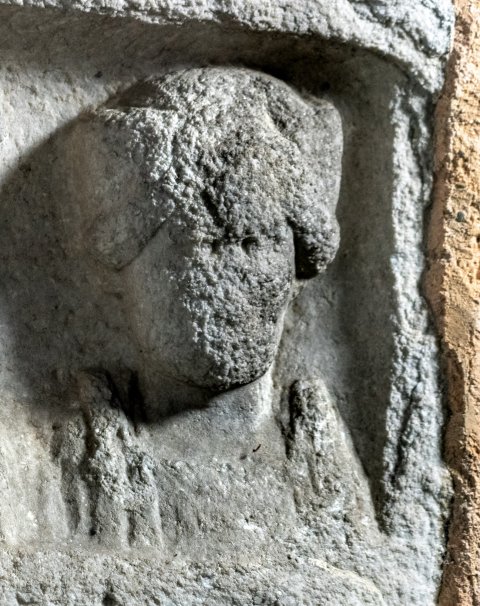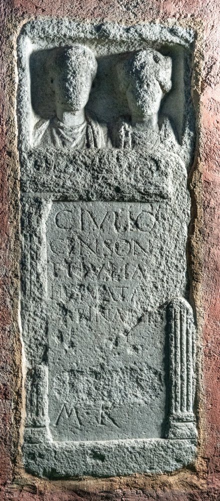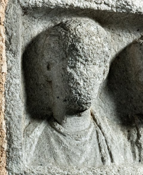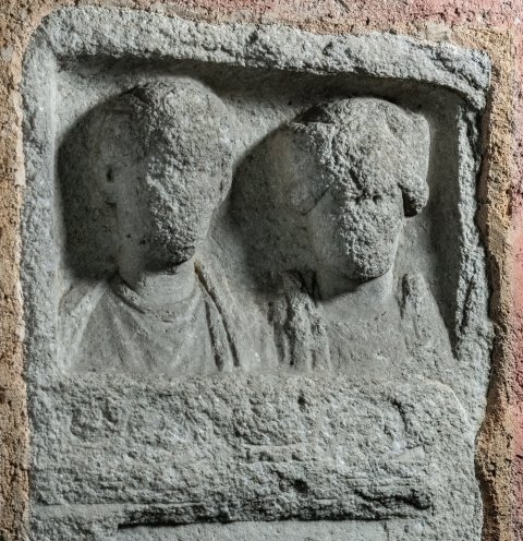 In Rechtecknische zwei Büsten (Ehepaar). Links Mann: bartlos, kurze Locken, Tunica, Toga. Rechts einheimische Frau: Haube, Flügelfibeln.