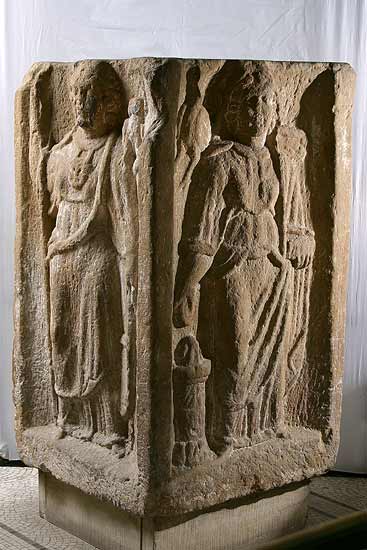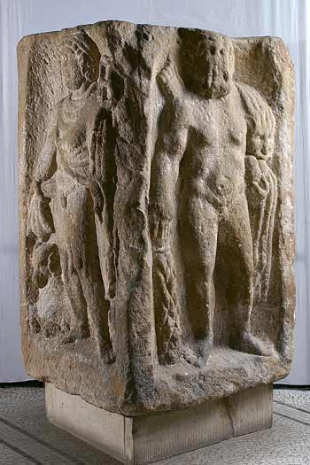 - Mythische Figuren : Juno in Chiton und Mantel, auf der rechten Schulter Pfau, in der Linken Kästchen, die Rechte mit Schale über zylindrischem Altar. Minerva in Chiton, Mantel, Helm und Ägis, über der linken Schulter Eule, die Linke auf dem Rand (mit Zackenband) des Rundschildes, in der Rechten Lanze. Hercules nackt, bärtig, Löwenfell über dem linken Arm, in der Linken Äpfel, über der rechten Schulter Köcher, die Rechte auf Keule gestützt. Mercur nackt bis auf Mantel und Flügelkappe, im linken Arm Caduceus, in der Rechten Geldbeutel, neben dem rechten Bein liegender Widder.