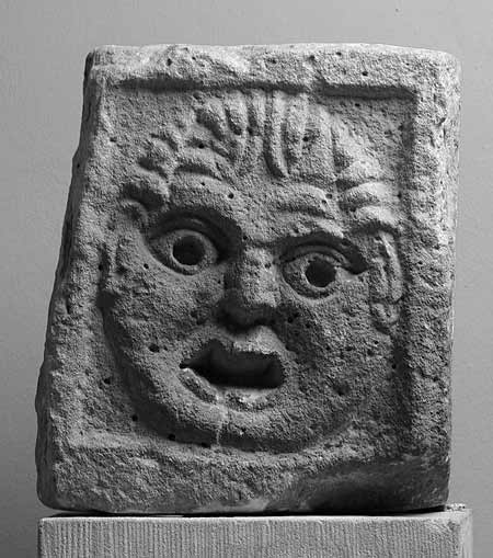 - Auf einer Seite einfach gerahmtes Bildfeld mit maskenartigem bartlosen Gesicht mit geöffnetem Mund (Satyr mit Tierohren ?).