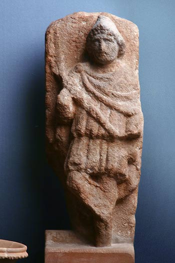- Mythische Figur : vor ungerahmter Platte stehender Cautes in phrygischer Mützem Mantel und kurzem Ärmelgewand, Beine überkreuzt, in den Händen erhobene Fackel.