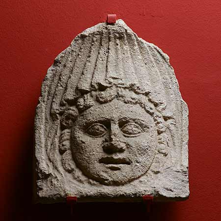 - Bartloses rundes Gesicht (Gorgoneion ? tragische Theatermaske ?), von Locken und einer eng gefältelten Draperie gerahmt. Horizontaler unterer Rand.