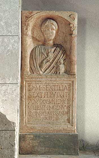 - D(is) M(anibus) Sextiliae / Sextili(i filiae) vixit / an(nos) XXX m(enses) II d(ies) XI / Valent(inius) Ingenuus / con(iugi) pientissim(a)e / fecit