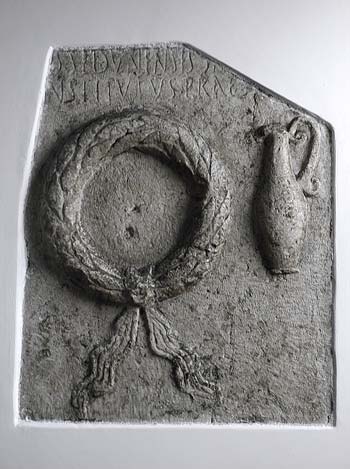 - Unterhalb der Inschrift Kranz mit Tänien, rechts davon schlanker Krug.