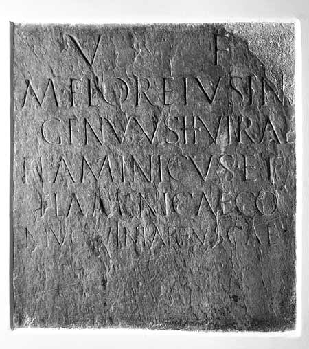 - V(ivus) f(ecit) / M(arcus) Floreius In/genuus II viral(is) / flaminicus et / flaminicae coniugi / Viniae Fuscae