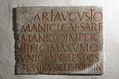- [C(aio) Cae]sari Augusto / [Ge]rmanici Caesar(is) f(ilio) / [Ger]manico imper(atori) / [po]ntifici maxumo(!) / [trib]unicia potest(ate) co(n)s(uli) / [civi]tates IIII vallis Poeni(nae)