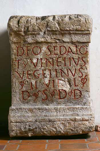 - Deo Sedato / T(itus) Vintelius / Vegetinus / II viral(is) / d(e) s(uo) d(onum) d(edit)
