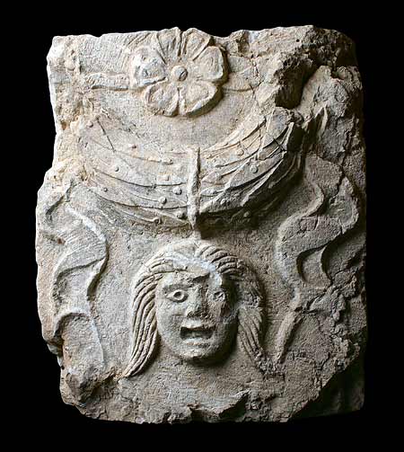 - Blättergirlande mit daran aufgehängter Maske, im Bogen darüber Rosette, seitlich flatternde Tänien.