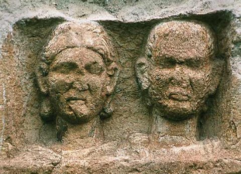 - In Rechtecknische zwei Büsten (Ehepaar). Links Frau: Mittelscheitel, Scheitelzopf. Rechts Mann: bärtig.
