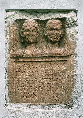 - D(is) M(anibus) Valerius / Priscianus mil(es) leg(ionis) / II Ita(licae) p(iae) f(idelis) vi(vus) fec(it) sib(i) et / Valeri(ae) Surillae / con(iugi) pi(e)n(tissimae)