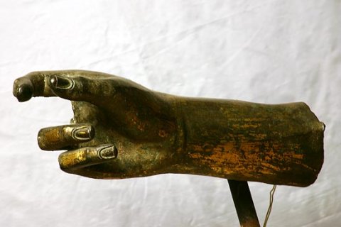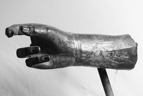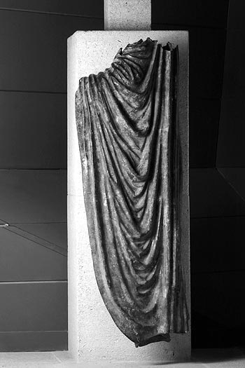 - Statue eines bekleideten Mannes : rechte Hand mit zur Greifhaltung gekrümmten Fingern. Faltenpartie einer Toga (?) über der linken Armbeuge.
