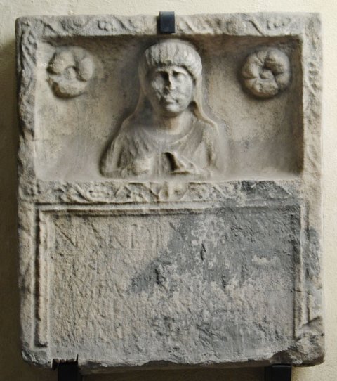 - In Rechtecknische zwischen zwei Rosetten Büste eines Mädchens: Schleier, Tunica, Mantel, in der Linken Vogel. Auf den Rahmenleisten Weinranke.