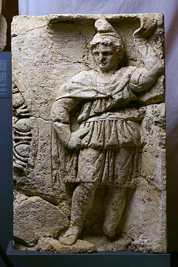- Mythische Figur ? (Attis oder Orientale ?): Jüngling in orientalischer Tracht mit phrygischer Mütze, Mantel, kurzem gegürteten Ärmelgewand und Hosen steht mit eingestütztem rec hten und stützend erhobenem linken Arm. Am linken Rand Rest eines Clipeus-Rahmens mit Eierstab.